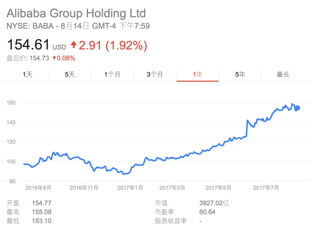 阿里巴巴今年以来涨势喜人,目前处于154美元的历史高位,相比年初的88美元,涨幅超过90%。