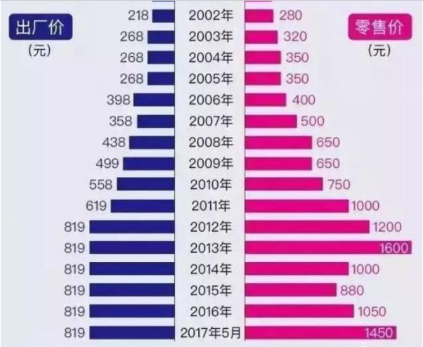 从出厂价来看,由于茅台酒出厂价819元未发生变化,而与2012年相比,“茅台酒一酒难求”却十分普遍。