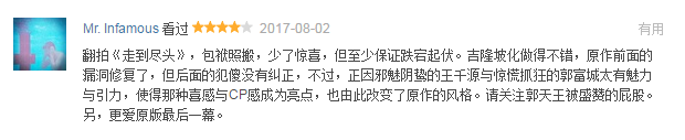 《破·局》赶上了暑期档的末班车,在好莱坞大片大举进攻九月之前,都有望凭借不错的品质和创意的故事赢得一定的回报,点映的好口碑也会在新局面开启之前发挥关键作用。