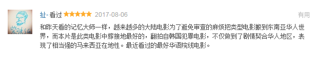 如有人认为影片把类型电影搬到东南亚华人世界,剧情契合华人地区,“是此类电影中嫁接地最好的……表现了相当强的马来西亚在地性”;有人盛赞郭富城和王千源的演技,“正因邪魅阴鸷的王千源与惊慌抓狂的郭富城太有魅力和引力,使得那种喜感与CP感成为亮点”。
