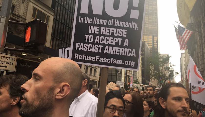 而他们手中的标语则集中在反种族歧视上。“反对白人至上主义!”“不!我们拒绝接受一个法西斯的美国!”巨大的纳粹符号被打上了红色的禁止标志,特朗普的头像也被画上了希特勒式的小胡子。还有人干脆举起牌子:请(总统)下台!