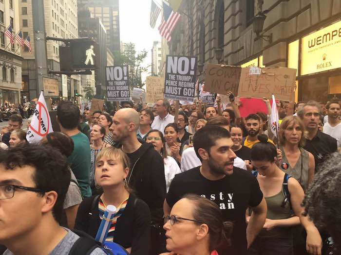 美国东部当地时间8月14日晚9点多,当乘坐私人飞机抵达曼哈顿下城的总统特朗普驱车回到中城特朗普大厦的家中时,等待他的是已经在楼下持续了4个多小时的万人抗议示威游行。