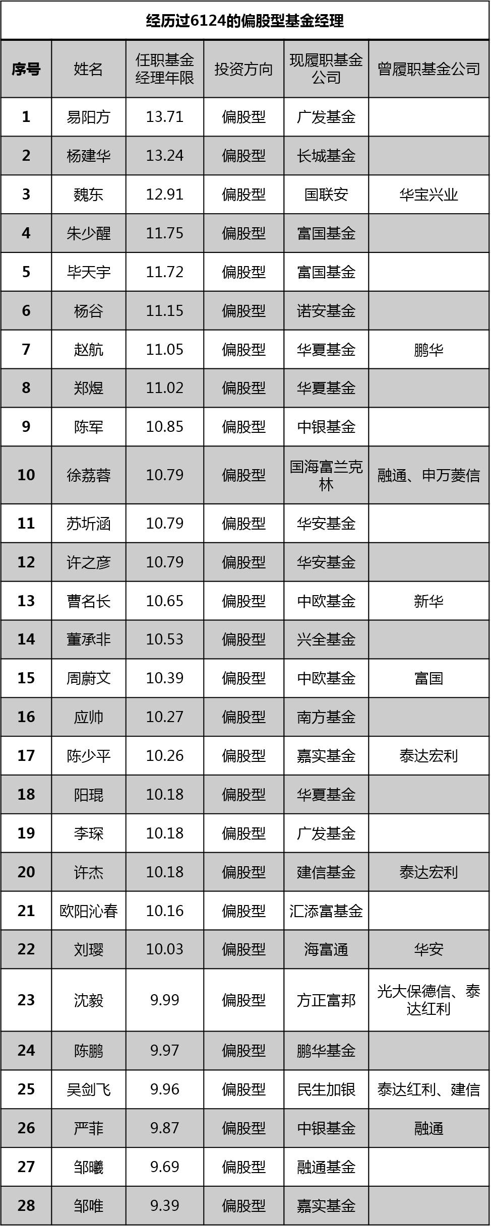 在28位偏股型基金经理当中,17位基金经理仅在一家基金公司担任过基金经理,有8位在两家基金公司担任过基金经理,有3位在3家基金公司担任过基金经理,这3位分别是:国海富兰克林的徐荔蓉,曾在融通和申万菱信担任基金经理;方正富邦的沈毅,曾在光大保德信和泰达宏利担任基金经理;民生加银的吴剑飞,曾在泰达宏利和建信基金担任基金经理。