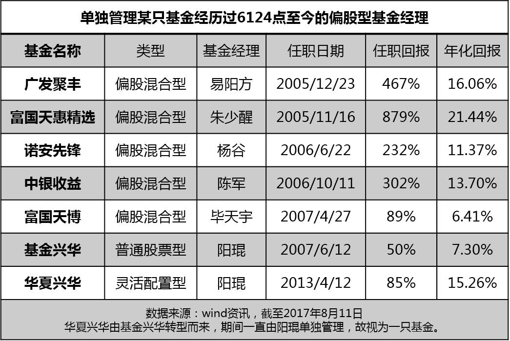 从基金公司来看,华夏基金共有4位基金经理在6124点之前便任职,其次是嘉实基金、富国基金、广发基金和中银基金,各有3位基金经理经历过6124点。