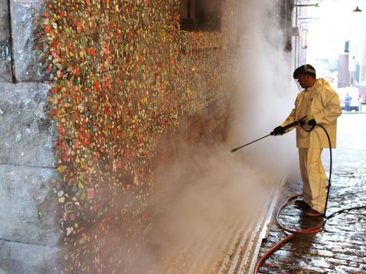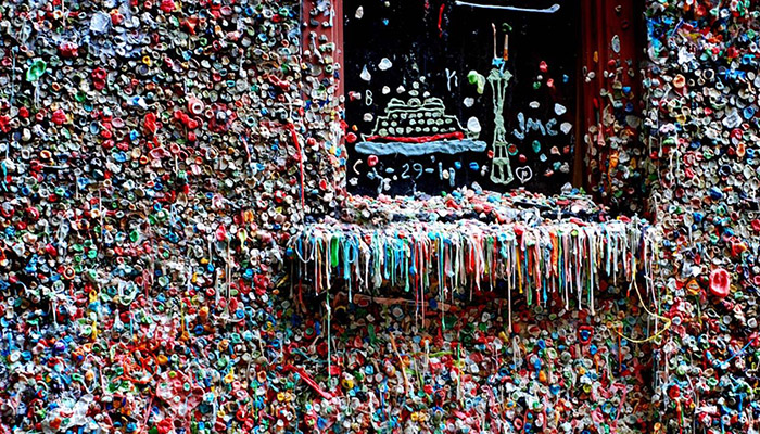 就像垃圾一样,口香糖也总是能吸引更多同类的聚集。2002年,伯恩茅斯市议会开始建造一堵以杰弗里·阿彻、托尼·布莱尔和乔治·布什的脸为背景的墙,号召嚼口香糖的人们把口香糖扔到这里。但事实证明,把口香糖扔在不属于它的地方这一习惯实在难以打破。2015年,西雅图清理了一堵有着20年历史的“口香糖墙”,后者已经成了当地一大地标。清洁工们花费大约130小时才完成这项清理工作,共清理出了2350磅(约1066公斤)口香糖,整整用了94个桶来装。然而好景不长,据《西雅图日报》报道,两天之后便有一群快闪族开始重新往墙上粘口香糖。