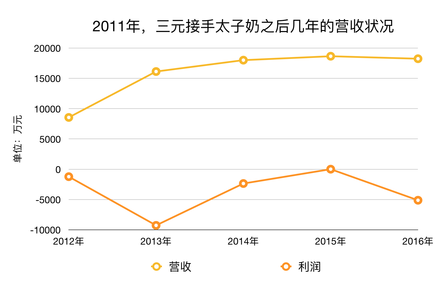 三元收购太子奶之后,曾对现有产品线进行补充,该业务也没能实现盈利。三元股份2013年亏损额达到2.27亿元其中太子奶就亏损9267万元。太子奶业务唯一一次扭亏为盈发生在2015年,还是因为该品牌下开展了其他业务,净利润只有5万元。