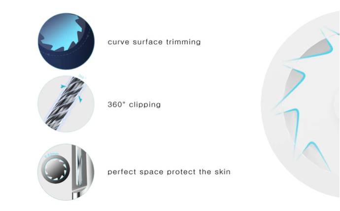 每隔 45 度分布着 10 个合金刀片,配合 360° 的旋转式修剪滚刀设计,让整个修剪器就像一个滚筒。。