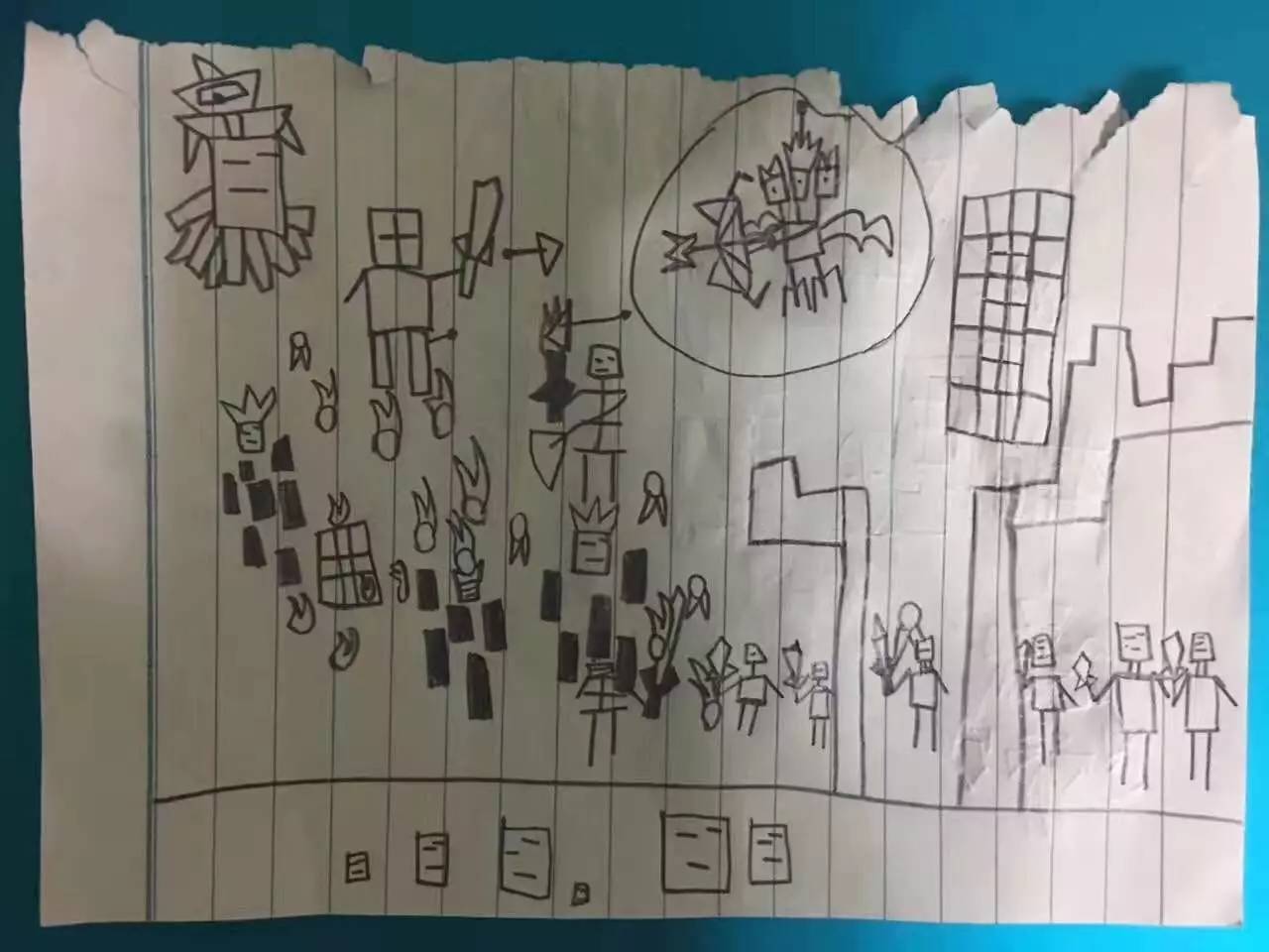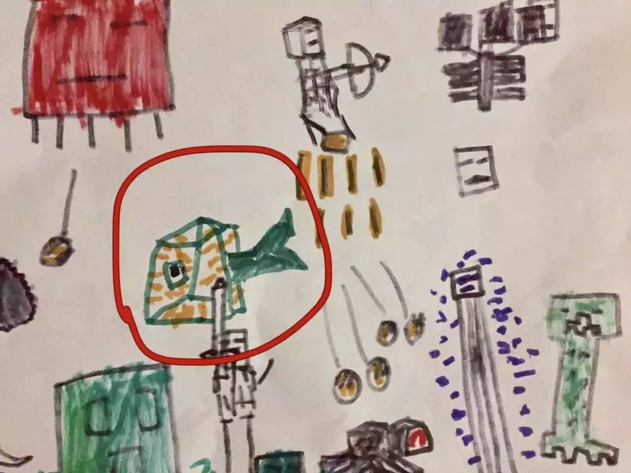 有一次,他独自做一幅关于冬天的手工作业画,兴头上,想在画面里加入地狱传送门,以及火焰神……我提醒他脑洞不要开太大。于是他改变主意,去给他的Minecraft人设图加了条鱼。