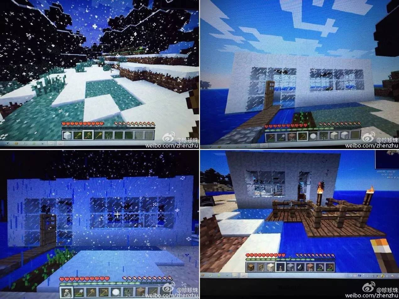 在《我的世界》里看见下雪,他想在湖上造一个“雪屋”。为了完成这个概念,我们找了一块结冰湖,把雪球粘成雪块做墙,用玻璃做窗户……一起造了开头,搜集材料选位置神马的。但他每天玩游戏的时间是有限制的,到点了雪屋还差一点。等他睡觉后,我加把劲就把简单的雪屋搭好了。