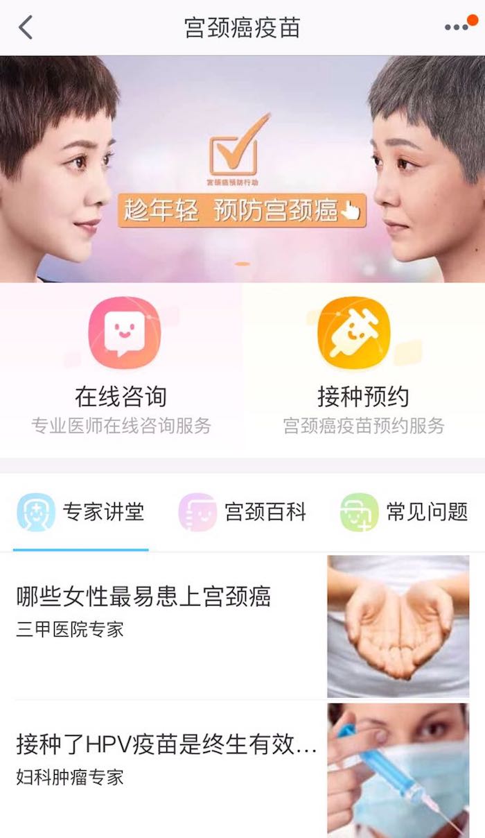 这项新服务包括在线教育咨询和线上预约注射两部分。提供咨询服务的在线机器人目前可以回答600多个相关问题,问题答案由GSK医学团队及其他专家提供。而花费1元钱后,用户即可在线上预约就近的社区卫生服务中心进行咨询和接种GSK的二价宫颈癌疫苗希瑞适。(阿里健康称会把这1元钱捐赠给中国妇女发展基金会的母亲健康快车超早期宫颈癌筛查公益项目。)