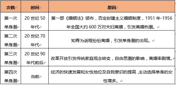 中国内地曾经出现过几次单身潮。第一次是在20世纪50年代,首部《婚姻法》带来了全国的离婚潮;20世纪70年代末,知青为了返城纷纷离婚,引发了第二次单身潮的出现;20世纪90年代以来,改革开放引发传统家庭观念的转变,第三次单身浪潮来临;到现在,随着经济的飞速发展和女性自主意识的提升,第四次单身浪潮逐渐显现。