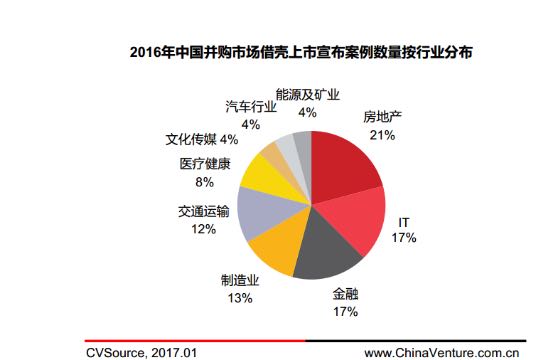 (分行业而言,房地产行业在2016年中国并购市场借壳上市宣布数量,达到21%。其中2016年10月,中国恒大表态将借壳深深房最为引人关注。)