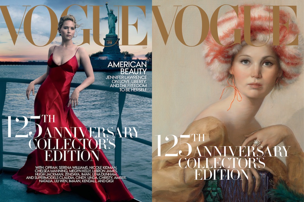 Jennifer Lawrence作为曾经的奥斯卡影后,影响力不容小觑。她已经上过两次VOGUE封面,其中一次还是2013年的九月刊。今年,商业化见长的VOGUE美国版还是选择了她。不过,除了为庆祝发行125周年特别刊推出的4个封面之一,由艺术家John Currin绘制的油画肖像有几分新鲜感,其余3个版本的封面照样逃不出月刊的一贯套路。