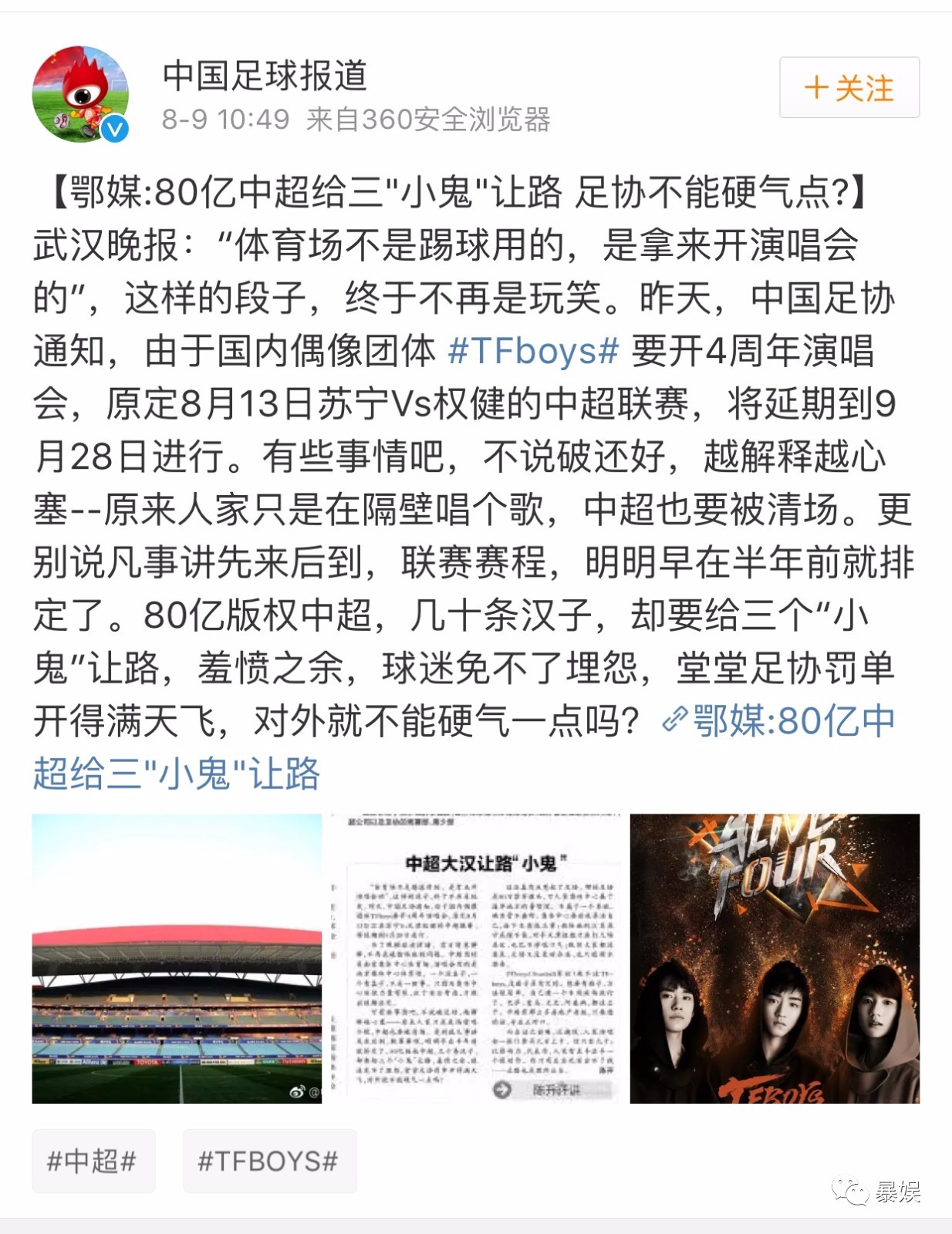 第一场风波过去后,随着演唱会日期的临近,第二波diss声传出来了。原来早已安排好的中超联赛和TFBOYS演唱会在同一天举行,但是就在比赛开始前几天,一则中国足协职业联赛理事会的消息让球迷和路人们怒了,矛头直指TFBOYS。