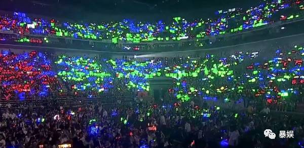 TFBOYS演唱会中,手持不同颜色荧光棒代表支持不同的应援粉丝。凯唯:蓝色 源唯:绿色 千唯:红色 团饭:橙色