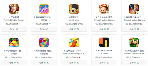 本周免费榜《王者荣耀》取代《最囧游戏 2》重回榜首位置,目前《最囧游戏2》排名第3,从目前微博、贴吧以及媒体新闻热度来看,《最囧游戏2》在下周依然能保持稳定态势,不过这一态势能否继续维持还需等待运营方的把控。除此之外,本周《海滨消消乐》位居第2,《欢乐斗地主》排名第4,《魂罗斗:归来》排名第5。免费榜TOP5之内腾讯游戏占3个席位。