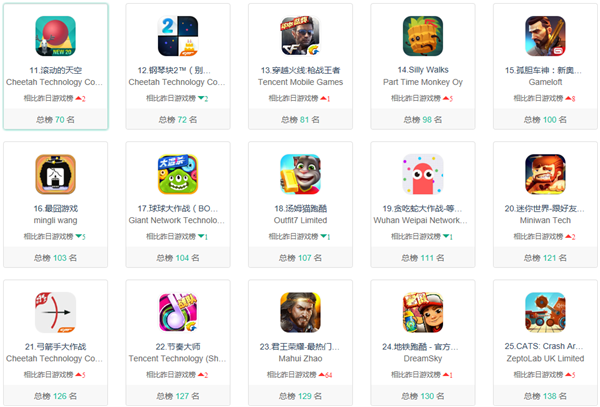 TOP30方面,新游突围的机会极微,本周仅有《Silly Walks》和《君王荣耀》突围成功,但这两款游戏的排名略后,《Silly Walks》是一款休闲益智游戏,主角小菠萝要通过完成不同的任务来通关各个关卡,从而获得金币装扮自身或者解锁更可爱的形象。整体来看玩法创新点不多,难敌精致的老游戏。目前,《滚动的天空》《钢琴块2》《穿越火线:枪战王者》《孤胆车神:新奥尔良》等榜单老牌游戏常客地位依然十分稳定。