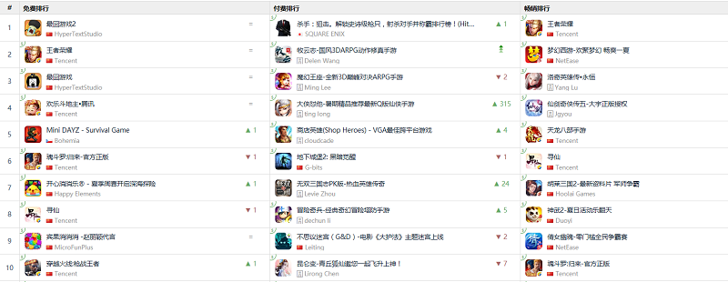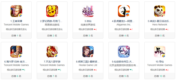 近几周,畅销榜新游突围的力度加大,打破了腾讯、网易长久以来平分天下的格局,本周畅销榜TOP10,腾讯占据4个席位,《王者荣耀》稳居榜首,《魂罗斗:归来》排名第6,《天龙八部手游》排名第7,新游《寻仙》排名第10,网易仅有《梦幻西游》进入TOP10。