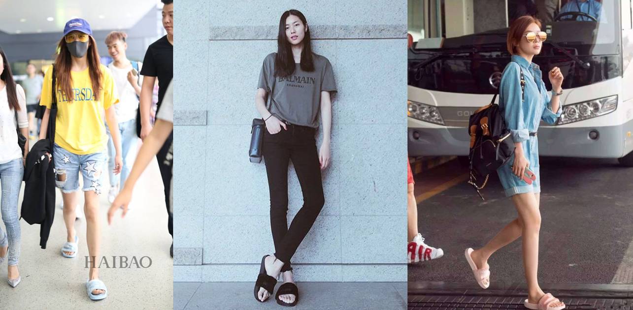 这款拖鞋也迅速赢得了国内女星的青睐,刘雯、袁姗姗、关晓彤就对三种颜色进行了不同的演绎。