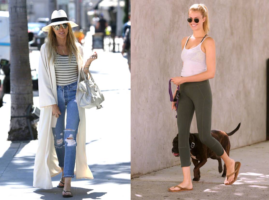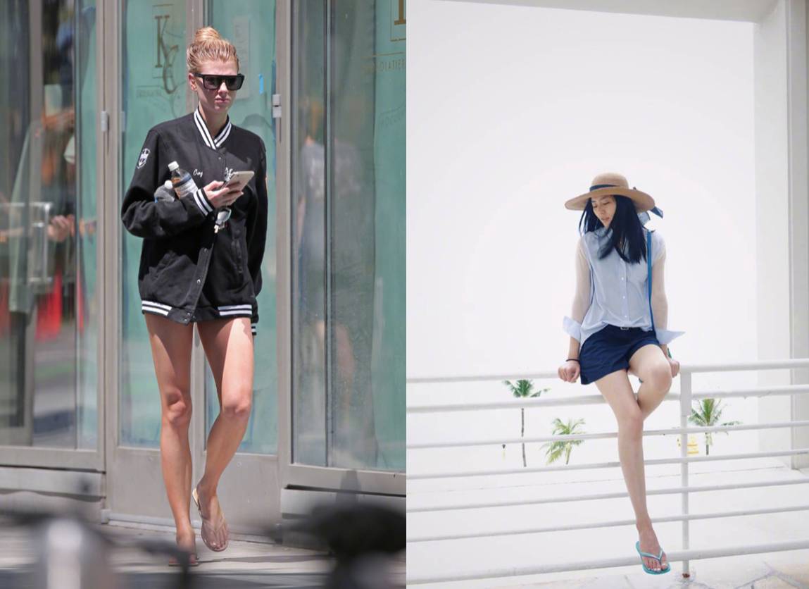 高腰牛仔裤/短裙搭配简约人字拖,去掉包裹,将腿型衬托得更加纤细修长,自成一道优美风景~