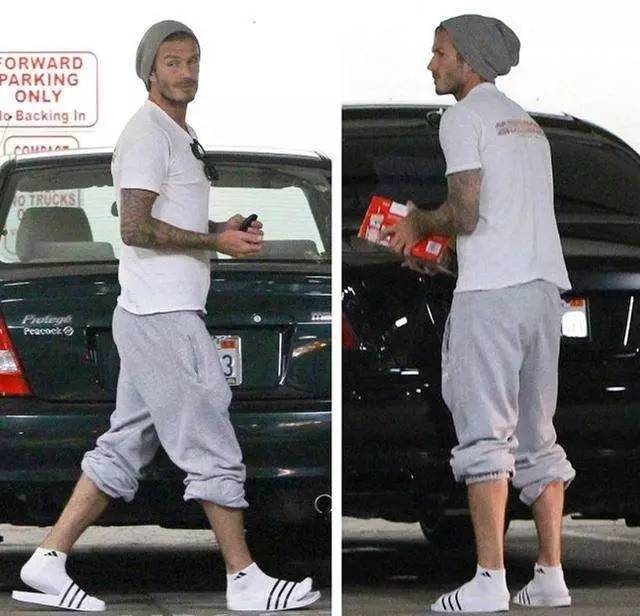 ↑小贝,白底条纹+白袜子,还很心机地将长裤卷至小腿,瞬间从大爷遛弯升级为潮人出街。