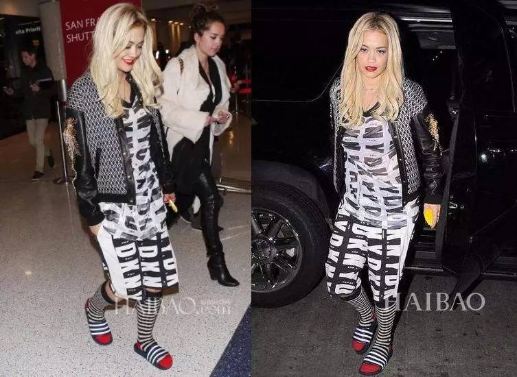 ↑Rita Ora,条纹拖鞋搭配条纹袜,两种设计合二为一,不得不说有一种怪诞的和谐感。