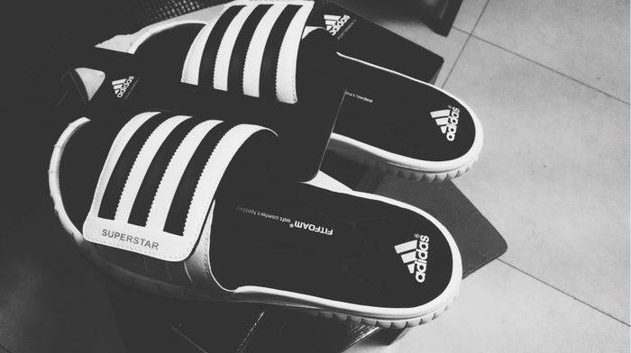 阿迪达斯经典的条纹设计,黑白配色,粘扣式的固定带,鞋底采用CloudFoam Ultra海绵的回弹材料,脚感堪比跑鞋。