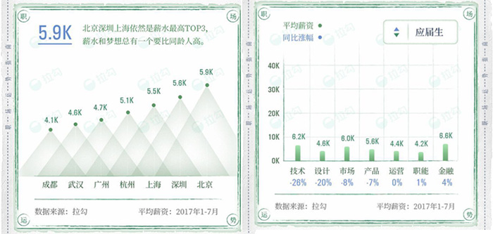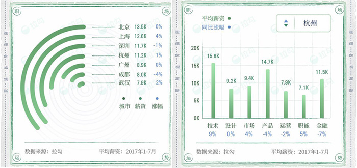 8月拉勾网发布《2017年中国互联网薪酬报告》,以其平台用户为样本,总结梳理了1月到7月不同领域和岗位的平均薪酬。结果发现半年内市场对AI人才的需求激增,杭州成为北上深后互联网第四高薪城市。