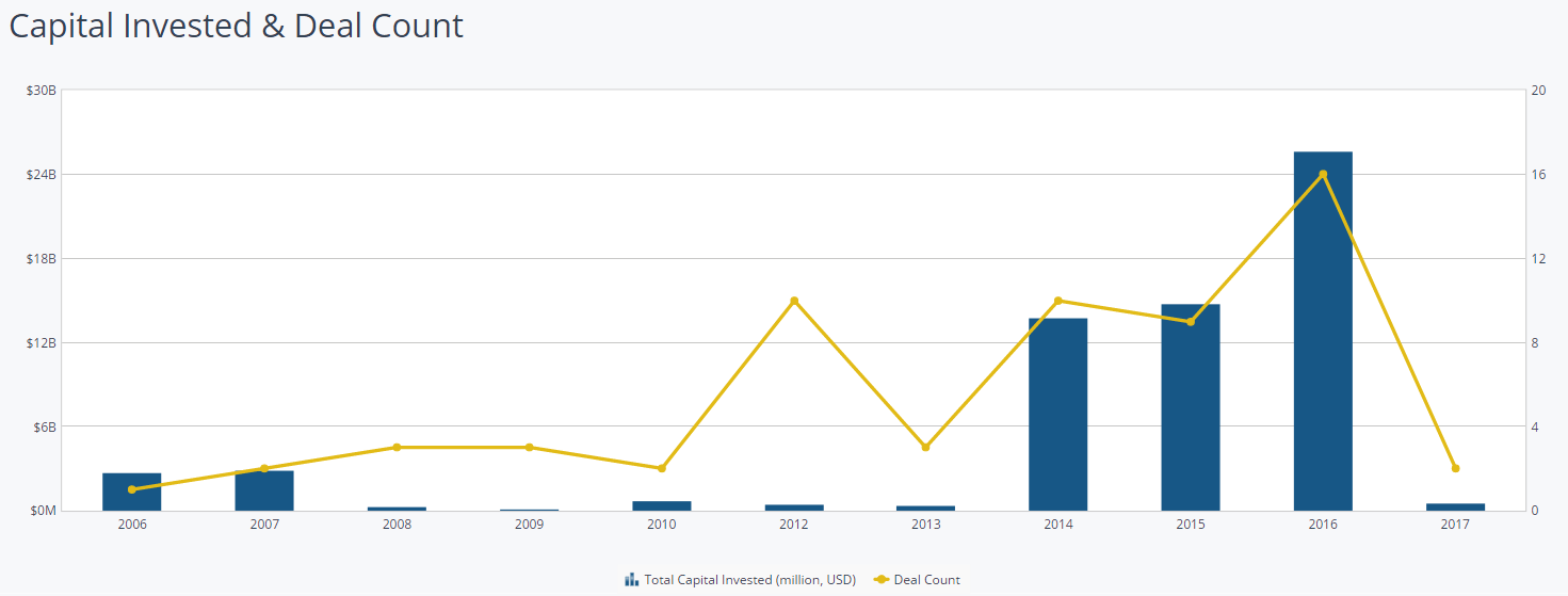 在直投领域,QIA最近三年投资显著增加。2014年以来,QIA的投资进入一个井喷期。2014至2016年3年间,QIA累计投资金额达到540.8亿美元,35宗;平均每个月都有1笔投资。在经历2008年金融危机之后的几年低迷后,QIA迎来一个投资高峰。