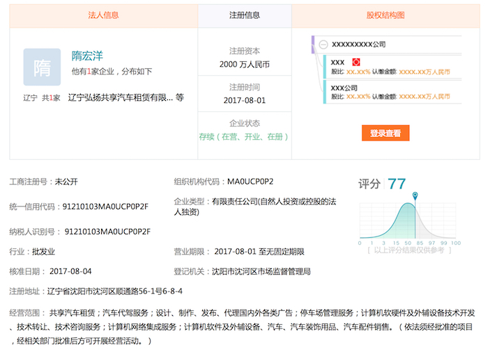 据悉,已经面世的20台“共享宝马”由辽宁弘扬共享汽车租赁有限公司(以下简称“弘扬”)负责运营。通过查询企业信息,界面新闻发现该公司于本月初(2017年8月1日)注册,注册资本2000万元人民币,经营范围包括共享汽车租赁、汽车代驾服务、广告设计、制作、发布、代理以及停车场管理服务等。