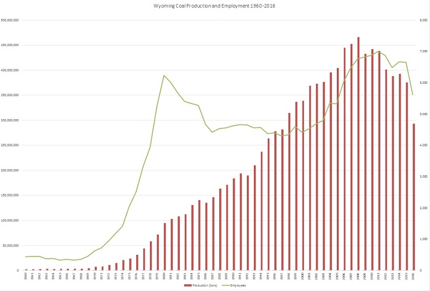 然而,在2008年怀俄明州煤炭产量创下4.24亿吨的历史新高后,整个行业开始走下坡路。从1960年代以来,该州煤炭产量一直在稳步上升,并在2008年达到了峰值,但之后开始逐步减少,特别是2015年至2016年期间,产量下降了21%。2016年年底,该州煤炭行业就业人数为5627人,比当年3月减少了713人。