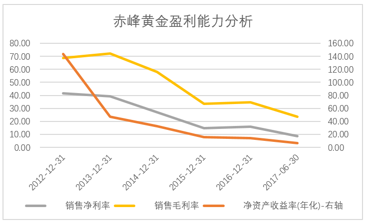 既然如此,赤峰黄金的盈利能力也就难以有效改善。至少在短期看不到改善的希望。看一下过去几年赤峰黄金盈利能力几个关键指标的表现。更能体会出需求和价格的天花板对于这家公司盈利能力的影响有多大。自2012年借壳上市以来,其盈利能力呈下滑趋势。