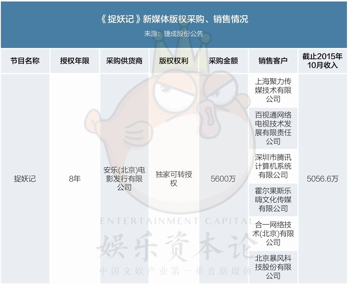 以《捉妖记》为例,出品方安乐影业卖给华视网聚的价格是5600万,后者在当年10月份以前就从腾讯视频、PPTV、乐视视频、百视通等6家平台收回了5056万的成本。考虑到二轮及多轮售卖,收回成本不成问题。