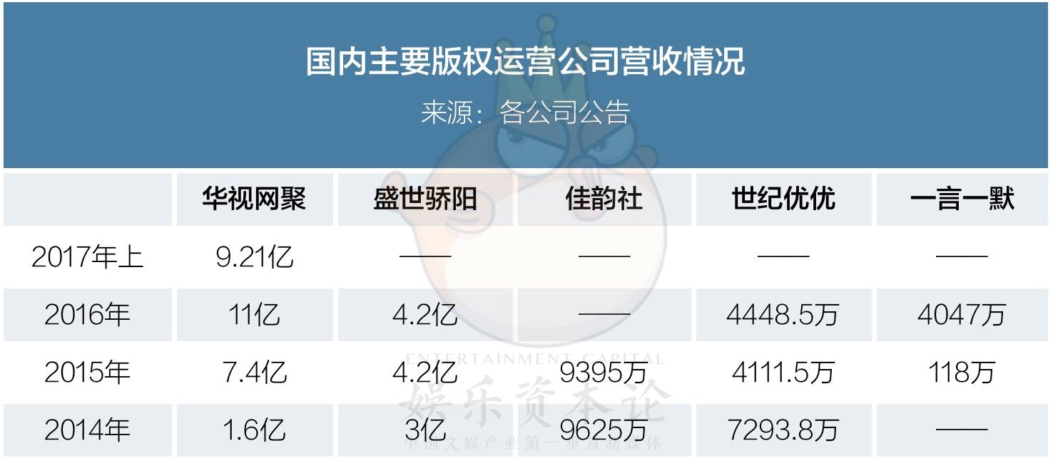 只是年收入过亿的规模化企业,只有华视网聚、盛世骄阳两家。“作为中间商,版权运营行业的想象力有限,而和渠道方的合作需要多年维护。大资本方在该领域没有砸钱的意愿,小公司没钱批量化购买热门剧。”