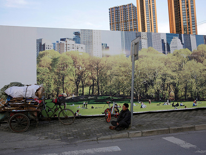 2016年11月28日,上海,一名男子坐在印有公园图像的广告牌前休息。