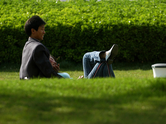 2005年4月20日下午,地坛南门,一对情侣在春天里晒太阳。