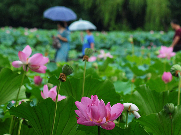 2017年8月1日,杭州细雨蒙蒙,西湖曲院风荷公园和孤山公园里游客不少,撑伞在雨中赏荷别有一番韵味。