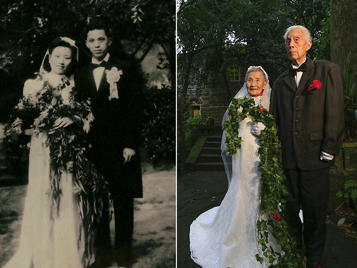 70年前,在北碚区北温泉公园数帆楼前,一对新人拍下了弥足珍贵的一张婚纱照。70年后的同一天,两位老人再次来到这里,纪念他们70周年铂金婚,并在同一地点再次拍下这张跨越70年的结婚纪念照。图片来源:视觉中国
