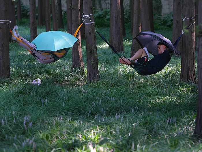 2006年8月25日,南京一处公园树林里睡着吊床休闲避暑的市民。