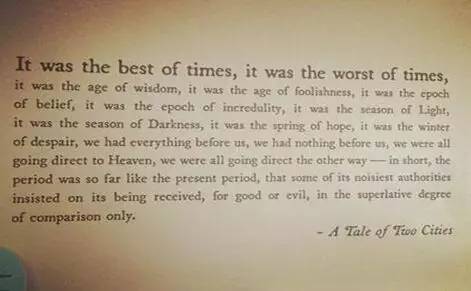 “这是最好的时代,这是最坏的时代;这是智慧的时代,这是愚蠢的时代;这是信仰的时期,这是怀疑的时期;这是光明的季节,这是黑暗的季节;这是希望之春,这是失望之冬;人们面前有着各样事物,人们面前一无所有;人们正在直登天堂,人们正在直下地狱。”