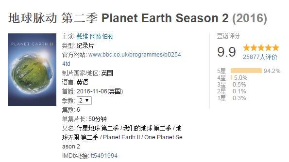 2016年,BBC再出一部《地球脉动2》,豆瓣最终评分9.9,是这个地球上口碑最强的片子。