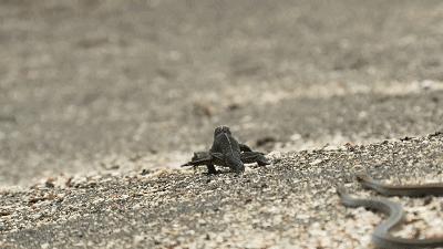 对岸的沙滩上,即将出生的海鬣蜥宝宝却大难临头:一大波蛇叔叔正埋伏着虎视眈眈,只要有一只海鬣蜥发觉,他们就会以最快的速度上前围剿。