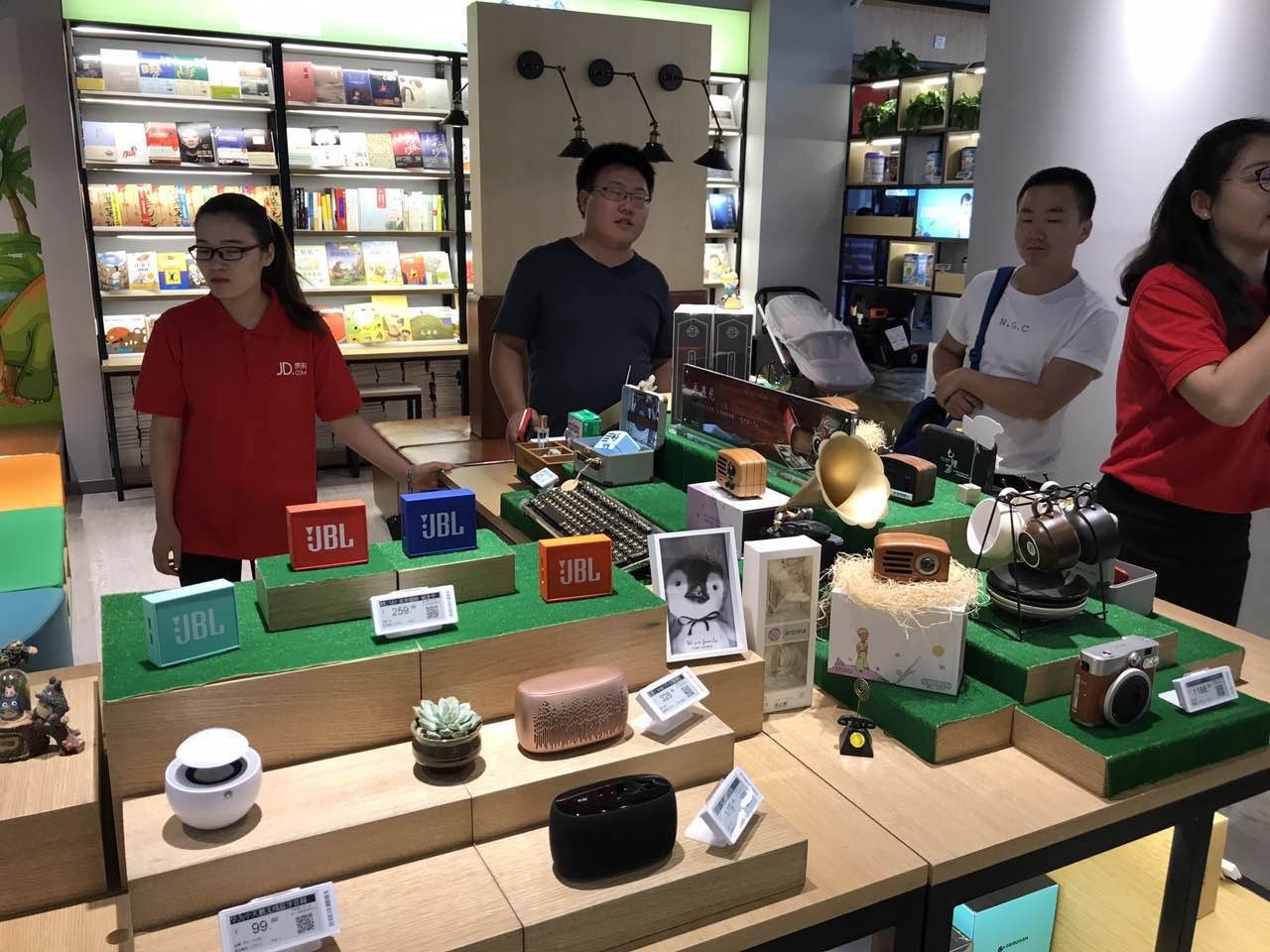 其次,处处是用心设计的场景,激发顾客购买欲望。这里营造了爱旅行、爱健康、女人心等多个场景。比如,在爱旅行区有摩托罗拉对讲机、科大讯飞的翻译器、京东的电子阅读器甚至小巧的洗漱包,都是旅行达人的最爱。