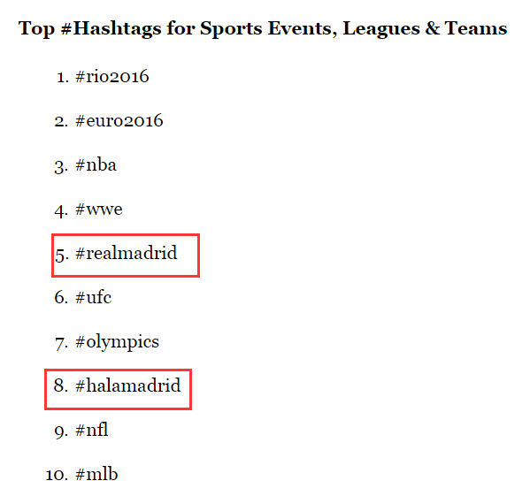 皇马在脸书、推特和Instagram上有着强大的影响力。根据福布斯的报道,在2016年,Instagram十大体育标签中,皇马占到了2个,分别为#RealMadrid和#HalaMadrid。社媒评估平台MVPindex的首席执行官凯尔·纳尔逊(Kyle Nelson)介绍说,皇马的社媒指标价值大约为17亿美元,几乎占到36亿美元球队总价值的一半,是职业体育俱乐部中社媒指标价值最高的。
