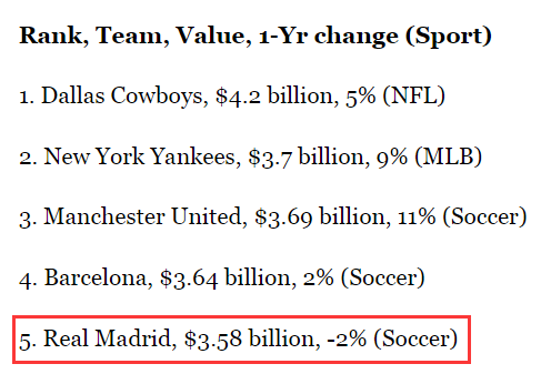 福布斯最有价值体育俱乐部TOP50(部分)