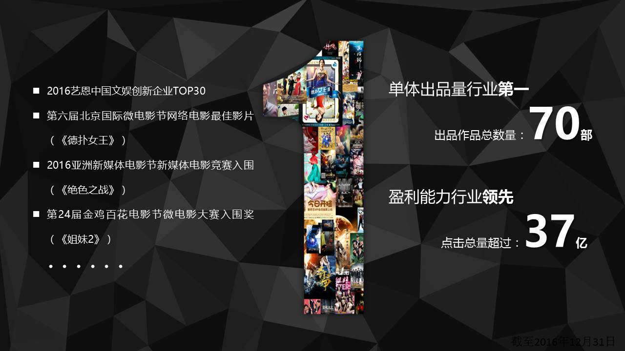 短短4年间,其出品的网大作品《德扑女王》系列三部曲在腾讯视频总播放量达到2.12亿次,并荣获第六届北京国际微电影节网络电影最佳影片。《绝色之战》在爱奇艺上线8小时网络票房破百万,3天付费点击破千万;《上位》和《姐妹》分别收获约8亿、4亿点击量。