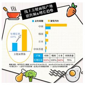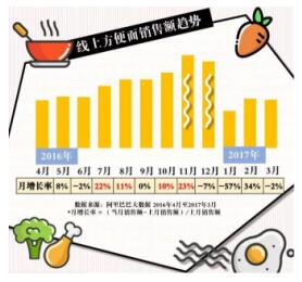 CBNData基于阿里巴巴大数据发布的《2017线上方便面相关消费系列研究》(以下简称《研究》)显示,从线上整体方便面销售情况来看,2017年销量较2016年同期增长迅猛,年增长率上升157%。