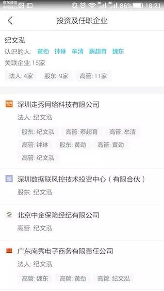 紧接着,虎嗅又在公司登记注册APP上查找了纪文泓本人直接参股的公司(4家公司法人代表、9家公司股东):