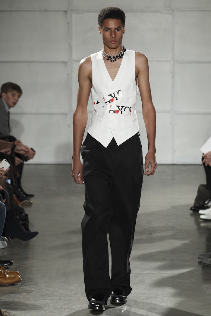 不过,秀场上的胶带花样要更丰富些:光颜色就有黑、白、黄、蓝可选;胶带上面文字内容也更多、更有趣,除了前面提到的这些面向年轻人的喊话,也有设计师对于纽约的情结,比如“I ❤️NY”、“I ❤️ YOU”等等。