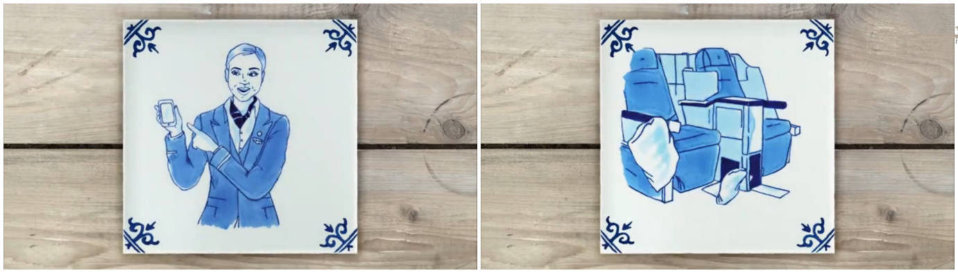 荷兰皇家航空长达3分20秒的安全宣传片以动画形式在一1000件Delft Blue青瓷片上呈现。这里的青花瓷是荷兰代尔夫特蓝陶,源自300多年前荷兰工匠对中国的青花瓷的模仿,如今已经成为荷兰国宝。这个飞行安全视频动用了数千块代尔夫特蓝手绘瓷砖拼接成动画。